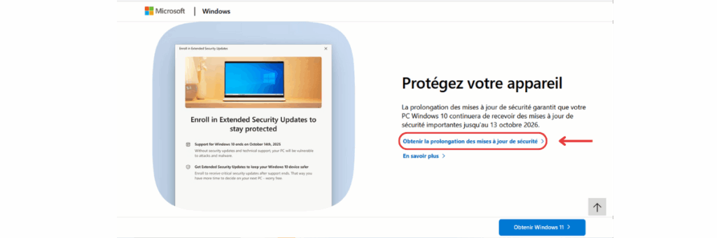 - Il faudra ensuite cliquer sur “En savoir plus sur la fin du support”, toujours dans l’onglet “mises à jour de sécurité” des paramètres. L’utilisateur·ice sera alors redirigé·e sur une page internet faisant très largement la promotion de Windows 11. Il faudra cliquer sur “Obtenir la prolongation des mises à jour de sécurité”, dans la section “Protégez votre appareil”.