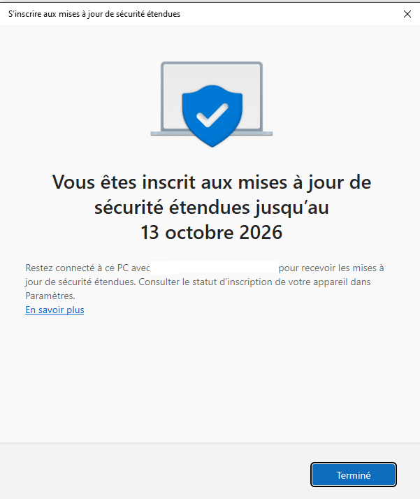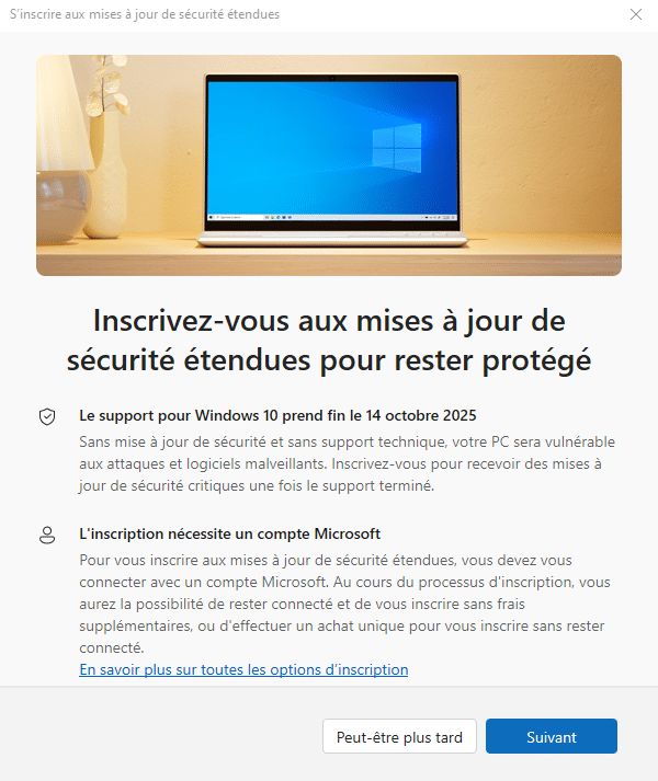 L’extension des mises à jour de sécurité, que Microsoft a annoncé être déployée depuis le 6 octobre, n’est disponible que depuis quelques heures sur certains ordinateurs. Et aucun bandeau n’informe clairement les utilisateur·ices de la marche à suivre pour obtenir l’extension gratuite. La procédure nécessite à minima 10 clics et manipulations de la part de l’utilisateur·ice, sans explications claires au départ.