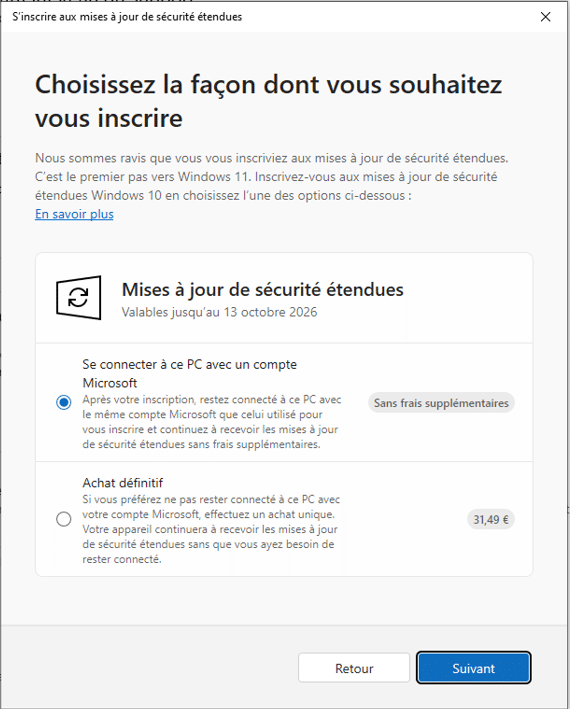 - Il sera ensuite proposé de se connecter à un compte Microsoft préexistant, ou d’en créer un. Une fois connecté, l’utilisateur·ice a le choix entre : payer 31,49 euros pour avoir accès à un an supplémentaire de mises à jour de sécurité sans compte Microsoft, ou rester connecté pour l’obtenir gratuitement.